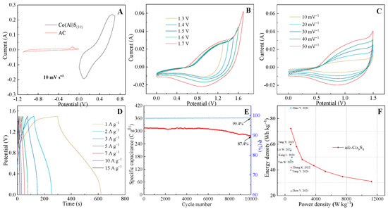 Supercapacitor performances of the Co(Al)S//AC device. (A) CV curves of the AC and the Co(Al)S(10) at 10 mV s−1 in a three-electrode system; (B) CV curves at 10 mV s−1 in different working potentials; (C) CV curves at 1.5 V in different scan rates; (D) GCD curves at different current densities; (E) cycling stability at 1.0 A g−1; (F) Ragone plots [14,24,27,39,46,48,49].
