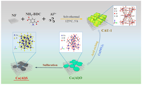 The preparation of the cobalt sulfides is illustrated in Scheme 1, where methanol, 2-amino-terephthalic acid (NH2-BDC) and NF were used separately as solvent, functional ligand and support by mixing metal salts to construct the CAU-1 sacrificial template via a solvothermal method. Subsequently, the Co(Al)O intermediate was prepared through ion exchange/acid etching in Co(NO3)2 solution, and then the Co(Al)O intermediate was sulfurized into cobalt sulfide with amorphous/crystalline heterophase (Co(Al)S) using Na2S as the sulfur source. In this strategy, the CAU-1 template was also a nitrogen and carbon source, while the physicochemical and electrochemical properties were tailored by adjusting the concentration of the sulfur source.