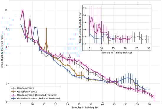 The error is calculated as the absolute difference in the target atomic percentage Y and the measured atomic percentage . This error is for the ith element in an n-ary composition. For a complete sample, the error is the mean of all differences for all elements, often referred to as the mean absolute error (MAE). In this study, the training samples were ternary, quarternary, or quinary transition metal alloys. The target compositions in Figure 2 were all quinary alloys selected from six possible elements: titanium, vanadium, niobium, tantalum, antimony, and iron. The manifold error is taken over all compositional complexity; the main graph in Figure 2 represents the error in prediction for ternary, quaternary, and quinary alloys. The error shown is the average of 10 model runs, with each run sampling a different initial dataset. The shown error bars are the first standard deviation of error across all 10 runs.