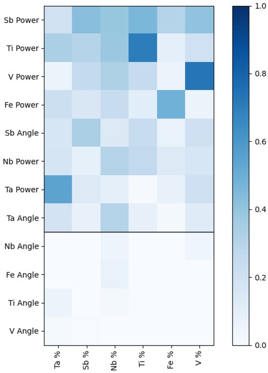 The mutual information index (MI) for a 12-dimension target space (gun power and gun angle for six elements) shows that eight of those dimensions are strongly correlated. The sputtering power for the elements is strongly correlated and strongly affects the atomic percentage of all the other elements. It is unsurprising that each element’s gun power has the highest mutual information with its atomic percentage. Still, the MII with its atomic percentage is not uniformly high for every element. For example, Sb gun power affects Ti atomic percentage as much as it does its own. However, the angles of the sputtering guns relative to the substrate play a negligible role for almost all elements. Only the angle of the Ta and Sb guns impacted the atomic percentage of other elements. This is likely due to the high Sb and Ta sputtering rate relative to all the other elements. The high sputtering rate of Sb and Ta means they can easily dominate the sample composition if they are both pointed directly at the substrate. Moving the angle of the gun away from the target is an effective way to modulate these high sputtering rates. For the other elements, whose sputtering rates are significantly lower than Sb or Ta, if they are pointed away from the substrate, their sputtering rate (and thus atomic percentage) quickly approaches zero. The MII for these values is shown below the black bar in Figure 4. Their angle must be set so they are always pointed directly at the substrate. Regarding mutual information, this means the angle of Ta and Sb has a high MII with the final composition and all other elements have a low MII.