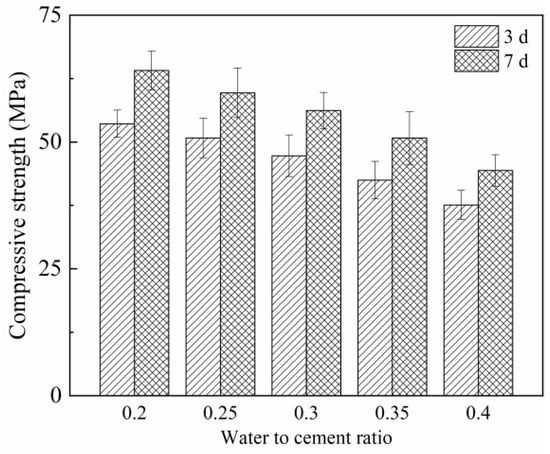 The compressive strengths of the RT-cured CFRCC with various water-to-binder ratios were tested at different curing ages (3 days and 7 days) and are shown in Figure 4. It can be found that the compressive strengths for the samples showed a gradual reduction trend with the increased water-to-cement ratio. For the CFRCC with the water-to-cement ratio of 0.3, the 3 days compressive strength was near 50 MPa and the 7 days compressive strength reached up to 60 MPa, which was suitable for the early age strength formation of CFRCC in a negative-temperature environment; thus, the water-to-cement ratio was set to be 0.3 in the following experiments.