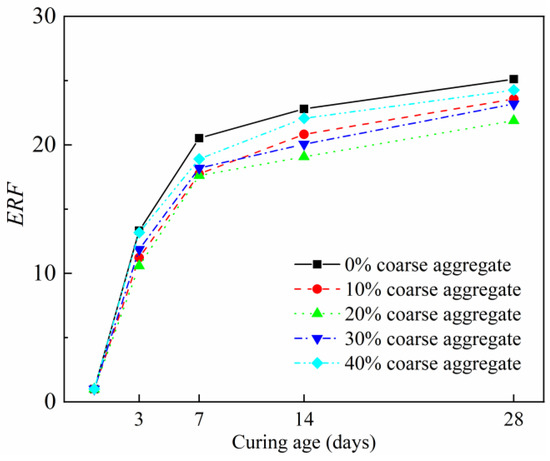 In this section, the specific effect of the coarse aggregate content on the electric resistance of the CFRCC was clarified. The samples were cured under RT curing conditions. The aggregate contents were varied from 0 to 40% of the volume of the mortar, and the CF content was fixed to be 0.75 vol%. Figure 5 exhibits the ERF of the CFRCC at different RT curing ages (0 day, 3 days, 7 days, 14 days, and 28 days), and it can be seen that the inclusion of coarse aggregate was advantageous to reducing the ERF of the CFRCC. Generally, the most significant increase in the ERF could be found from 0 d to 3 d in the samples due to the intense hydration reaction at the early curing stage, that the conductive pore solution was much consumed. Moreover, after 7 days, the increased velocity of the ERF was lowered due to the hydration reaction becoming stable after the 7-day curing stage. In addition, the inclusion of the coarse aggregate was advantageous to improving the conductivity of the sample, and this improvement effect exhibited an increasing then decreasing trend with the increased coarse aggregate content. To be more specific, when the coarse aggregate content was 20%, the sample showed the lowest ERF, and this represented the most stable electrical conductivity development for the sample. And when the coarse aggregate contents exceeded 20%, the ERF of the sample gradually increased. Collectively, the coarse aggregate showed the ability to improve the electrical conductivity, which was related to the modification effect of the coarse aggregate on altering the CF distribution situation in the CFRCC, because the much larger volumetric size of the coarse aggregate would much more easily influence the CFs inside the sample.