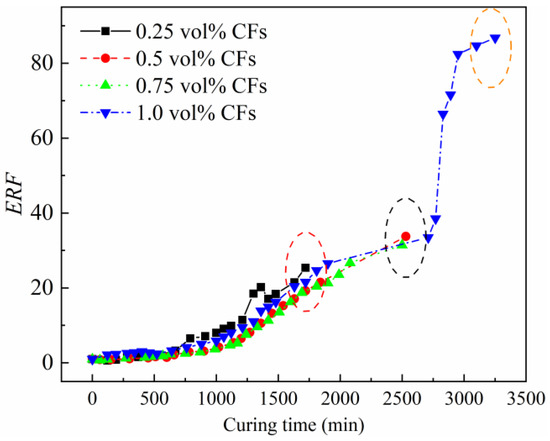 In this section, the CFRCCs with various CF contents were subjected to OH curing with an electric power of 30 W with an environmental temperature of −20 °C. The samples containing 0.25 vol%–1.0 vol% CF contents were used for comparison, because the samples with no CFs could not undergo the OH curing process even for a short time [23]. It can be found that most of the time, the increase in the CF content could lower the ERF of the sample during the OH curing process, as depicted in Figure 8, indicating the more stable conductive network inside these samples, which is beneficial for prolonging the curing duration of OH-cured CFRCC, thus improving the curing efficiency of the concrete fabricated under negative-temperature environments. To be more specific, the sample with 0.25 vol% CFs showed the highest ERF compared with those of the samples with higher CF contents, and when the CF content reached 0.5 vol%, the sample exhibited a comparable ERF increasing trend with the incorporation of 0.75 vol% CFs, indicating the beneficial effect of a 0.5 vol% CF content on improving the electrical conductivity of the samples. However, when the CF content reached 1.0 vol%, a prolonged curing duration was observed for the sample, while the ERP was larger than those of other samples, indicating that after reaching the percolation threshold, the increase in the CF contents exhibited an insignificant effect.