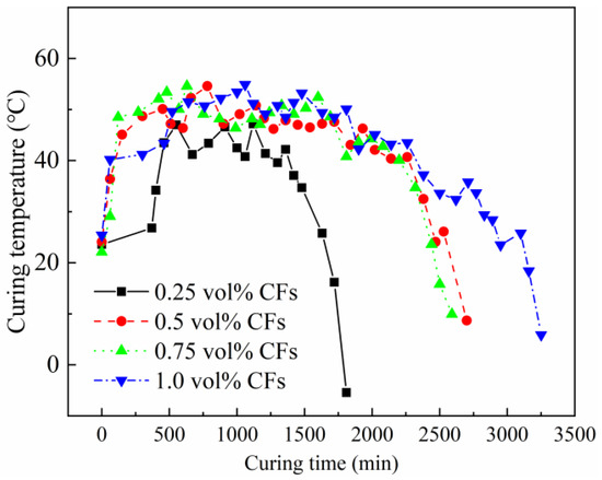 In addition, the curing durations of the different samples showed an obvious difference, and the sample with 1.0 vol% CFs showed the longest curing duration. The increased conductive network inside the sample could result in this prolonged curing duration; however, the performance should be verified further to clarify the effect of the prolonged curing duration.
