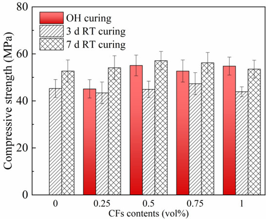 The compressive strengths the OH-cured CFRCC with various CF contents were tested and compared with those of the samples subjected to RT curing for 3 days and 7 days, respectively. The curing durations for the samples were consistent with the curing temperature results. To be specific, the CFRCC samples with a 0.25 vol% CF content were cured by 30 W OH curing for 1750 min, those with 0.5 vol% and 0.75 vol% CFs were cured for 2750 min, and the 1.0 vol% CF sample was cured by OH curing for 3250 min. The mechanical strengths are shown in Figure 10, and it can be found that OH curing could improve the compressive strength of CFRCC at −20 °C; the OH-cured samples always exhibited higher strengths to those of the 3-day RT-cured ones, even with a much shorter curing duration. Specifically, for the sample with a 0.5 vol% CF content, the compressive strength could reach up to 52 MPa, which was comparable to that cured by 7 d of RT curing. Moreover, the compressive strengths for the samples containing 0.5–1.0 vol% CF were similar under the same curing regime, and based on this, the optimal CF content could be determined to be 0.5 vol%.