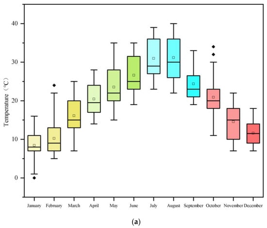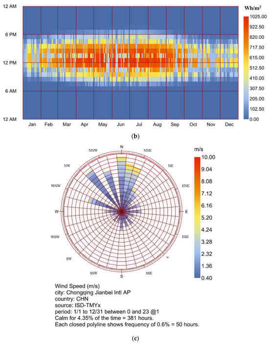 The municipality of Chongqing, nestled within the heart of China, exemplifies the quintessential climate of scorching summers and biting winters. The extrinsic meteorological data were procured from the meteorological station in the vicinity of the edifice under study. The box-and-whisker plot in Figure 1a delineates the monthly fluctuations in the ambient dry bulb temperature throughout Chongqing. In conjunction, the polar rose diagram in Figure 1b,c provides a visual depiction of the city’s annual direct solar irradiance and wind atmospheric datasets, forming the cornerstone of the boundary conditions for our numerical simulations and adeptly steering the incorporation of thermal and solar radiation parameters into the architectural model.