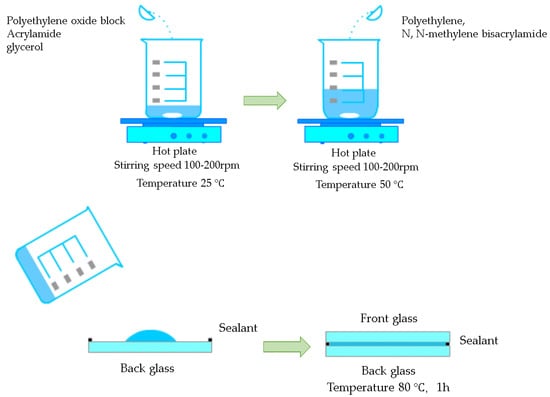 The specific preparation method for gel-based thermochromic glass is as follows: polyoxyethylene block copolymers, acrylamide, glycerol, polyethylene, and N,N’-methylene bisacrylamide were accurately weighed and stirred at 100–200 rpm in deionized water. The mixture was poured into the glass cavity and heated to 80 °C for 1 h to form a gel, as shown in Figure 2. A thermochromic gel layer was added to the outer layer of the glass, with a microcavity used to inject the thermochromic gel into the cavity, thereby forming a double-glazed unit with an air cavity. The thermal and optical properties of the gel-based thermochromic double-glazed windows used in this study are illustrated in Figure 3. The U value of the gel-based thermochromic double-glazed glass is 2.4 W/(m2·K), with an SHGC of 0.70 in the clear state and 0.18 in the obscured state.