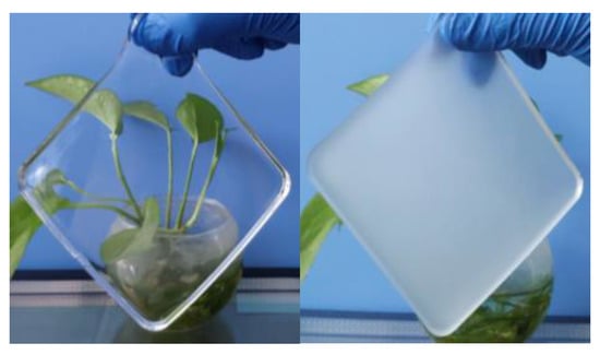 Comparison of the transparent and obscured states of the gel-based thermochromic material.