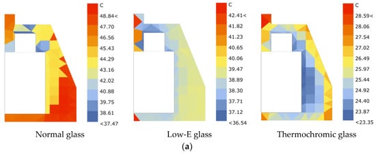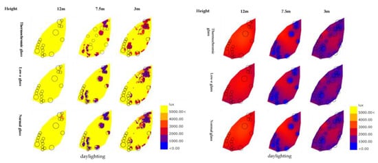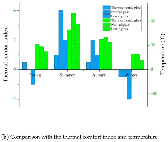 As depicted in Figure 8, during the summer season, both gel-based thermochromic glass and low-E glass exhibit excellent light regulation capabilities. They significantly reduce the intensity of light entering the interior, effectively mitigating the issue of excessive brightness caused by direct sunlight. The gel-based thermochromic glass, when obscured, effectively diminishes glare, enhancing visual comfort within the space and allowing for a softer and more pleasant lighting experience. However, even in its fully misted state in summer, gel-based thermochromic glass maintains a markedly superior indoor lighting effect compared with that of low-E glass, with illuminance levels capable of reaching 5000 lux, virtually indistinguishable from the levels provided by normal and low-E glass, eschewing any significant dimming. In contrast, as winter approaches, the transparency of the thermochromic glass increases, allowing more natural sunlight to penetrate the interior. Conversely, low-E glass, with its inherently lower light transmittance, fails to effectively introduce sunlight in winter, leading to a decrease in overall light intensity and comfort. The deployment of thermochromic glass stands to substantially elevate the ambient natural light indoors, with potential illuminance spikes up to 1000 lux, sufficiently satisfying the indoor lighting criteria, whereas the low-E glass falls short in this regard, mandating additional lighting sources.
