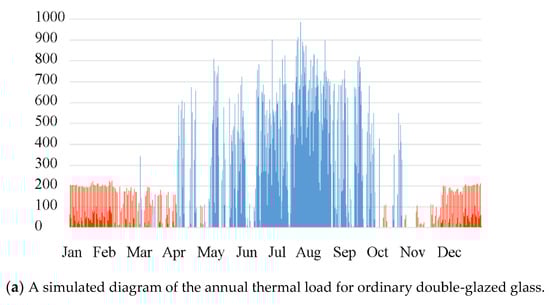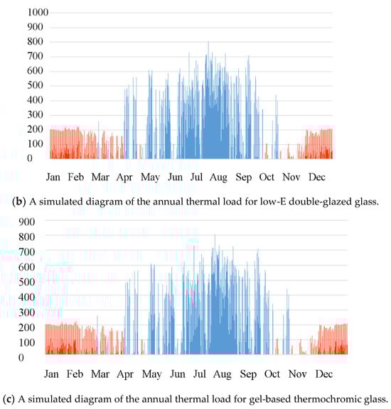 Figure 6 compares the annual building energy consumption for three different types of glass. The comparison shows that in the summer, the gel-based thermochromic glass is in the obscured state, with an SHGC value of 0.18. Compared with regular glass, it can reduce the air conditioning energy consumption by approximately 20%, and compared with low-E glass, it can reduce the cooling energy consumption by 12%. In the winter, the thermochromic glass is in the transparent state, performing similarly to regular double-glazed glass. In this scenario, thermochromic glass also has an advantage in terms of thermal insulation over low-E glass. This approach can effectively reduce the loss of indoor heat, thereby reducing heating energy consumption. According to simulation data, the use of thermochromic glass can reduce winter heating energy consumption by approximately 15%.