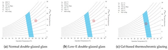 Figure 10 presents a comprehensive environmental performance simulation of the three types of glass in three commercial complexes. In terms of temperature control, the indoor temperature of the thermochromic glass was 27.1 °C, that of the low-E glass was 29.3 °C, and that of the regular double-glazed glass was 29.9 °C. The commercial atrium with thermochromic glass had ample natural light, no glare, and a gentle breeze, facilitating a comfortable sensory experience. Its enthalpy difference (Δh) between the outdoor state point or mixed point and the dew point was 58.2 kJ/kg, requiring a relatively small cooling load and, thus, a smaller air supply volume. The commercial atrium with low-E glass had sufficient natural light and no glare, but the indoor air was stagnant and windless, resulting in a stuffy sensation. Its Δh was 64.8 kJ/kg, requiring a moderate cooling load and, therefore, a relatively larger air supply volume. The commercial atrium with regular glass had radiative heat, causing a stuffy sensation, with a Δh of 66.2 kJ/kg, requiring a relatively large cooling load and, thus, a larger air supply volume.