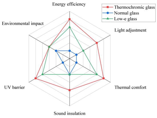 To conduct a comprehensive evaluation of the gel-based thermochromic glass in comparison with regular double-glazed glass and low-E double-glazed glass, particularly in terms of integrated environmental control, we assessed the following six aspects, as shown in Figure 11: energy efficiency (a metric quantifying the heat insulation and heat preservation capabilities of various glass types, with direct implications for energy usage), light modulation (the capacity of glass to regulate the permeation of light and mitigate glare), thermal comfort (the influence of glass on indoor temperature stability and its contribution to overall comfort), acoustic insulation (the effectiveness of glass in mitigating external noise interference), UV protection (the glass’s ability to shield against ultraviolet rays, safeguarding indoor items from light degradation and reducing potential radiation harm), and environmental consideration (a holistic view of the environmental impact across the life cycle of the glass, from production through disposal).