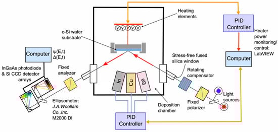 Figure 1 shows the experimental configuration for CIS deposition using a multi-source thermal co-evaporation system that incorporates instrumentation for RTSE measurement and monitoring. In the calibration experiments performed here, Cu and In2Se3 films were deposited step-wise on native oxide-covered c-Si wafers at room temperature and at 570 °C, respectively, using Cu and In evaporation sources held at different temperatures TCu and TIn. The sources incorporate alumina crucibles and Mo crucible liners (Radak II, Luxel, Friday Harbor, WA, USA). For the Cu and In2Se3 calibration depositions, the source temperatures spanned the ranges of TCu = 1335–1395 °C and TIn = 965–1025 °C, as used in the deposition of CIS thin films. These temperature ranges yield effective thickness rates of Cu and In2Se3 within the ranges of 0.35–1.03 Å/s and 2.83–6.76 Å/s, respectively.
