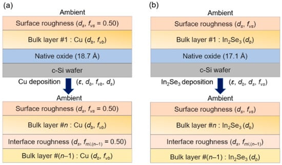 Structural models used in the analysis of real-time spectroscopic ellipsometry data acquired during the first steps (upper panels) and the nth steps (lower panels) of the (a) Cu and (b) In2Se3 depositions performed for Cu and In evaporation source calibrations, respectively. For the lower two panels, only the top-most nth (n > 1) layer and its underlying (n − 1)st layer are shown. The depositions were performed step-wise using different source temperatures on native oxide-coated crystalline silicon substrates at room temperature for Cu and 570 °C for In2Se3. The variable structural parameters in the models include the bulk and surface roughness layer thicknesses db and ds. For the surface and interface roughness layers of the Cu depositions, 0.50/0.50 volume fraction composites of the underlying/overlying media are used, and for the respective layers of In2Se3 (1 − fvs)/fvs and fmi,(n−1)/fmi,n, composites are used. The bulk layer void content fvb for Cu is determined from the Drude component of the complex dielectric function ε over the photon energy range of 0.75–1.00 eV. For the first step-wise Cu layer, fvb is assumed to be the same as that of the second layer.