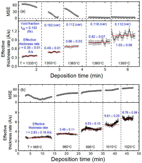 In the RTSE analysis results of Figure 3a for the Cu source calibration, the upper panel depicts the time evolution of the mean square error (MSE), which is a measure of the quality of the fit, and the lower panel depicts the instantaneous effective thickness deposition rate Reff = ddeff/dt. The effective thickness deff is the volume per planar area of the substrate and is given in this case (disregarding the time-independent interface contribution) as deff = (1 − fvb)db + (1 − fvs) ds = (1 − fvb) db + 0.5ds, where fvb and fvs are the void volume fractions in the bulk and surface roughness layers with fvs = 0.50 [19]. The panel of Figure 3a depicting the effective thickness rate also indicates the results of the Drude analysis of ε, yielding fvb values in the range of 0.11 to 0.15. The ability to extract bulk layer void fractions by this method is reduced for the first deposition step at the lowest Cu source temperature of 1335 °C due to the thinness of the Cu layer. As a result, fvb for this first step is fixed at the value obtained for the second step of 1350 °C. The results in Figure 3a suggest that the flux of Cu is stable over the time periods of 0.5 to 1 min at each deposition temperature.