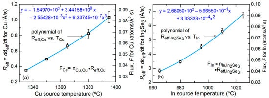 Figure 4 presents the deposition rates of Cu and In2Se3, given in terms of effective thicknesses from Figure 3a,b, plotted as functions of the respective Cu and In source temperatures. Also shown in Figure 4 are the two best fitting polynomials that describe the relationships. The next step in the calibration analysis is to derive the fluxes of the Cu and In atoms, Fx = (FCu, FIn) as functions of the effective thickness deposition rates of Cu and In2Se3, Reff,x,m = (Reff,Cu,Cu, Reff,In,In2Se3), respectively, where the subscript x indicates the metallic element and m indicates the deposited material. In a general film growth process, the atomic flux of element x can be evaluated from the effective thickness rate of material m by assuming that all evaporated atoms impinging on the substrate are incorporated into the growing film. As a result, the flux of atom x is given by
