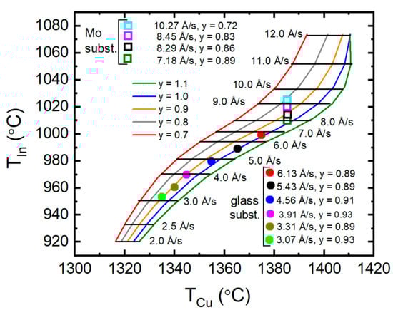 Equations (4) and (5) can provide the two source temperatures required to achieve specified values of the CIS effective thickness deposition rate Reff,CIS and [Cu]/[In] ratio y. These calculations apply (i) the polynomial coefficients dm,n of Table 2, relevant for the Cu and In fluxes, assuming fv,Cu and fv,In2Se3 both vanish, and (ii) the concentration of In in CIS from Table 1, applying the model as described in the previous paragraph assuming fv,CIS = 0. Thus, (Reff,CIS, y) are substituted into the right sides of these equations to give the pair of source temperatures (TCu, TIn). Deposition rate values Reff,CIS in terms of effective thickness ranging from 2 Å/s to 12 Å/s were assumed for five different y values centered at y = 0.9, including y = 0.7, 0.8, 0.9, 1.0, and 1.1 (with y > 1 representing Cu-rich CIS assuming interstitial Cu atoms). The resulting pairs of source temperatures (TCu, TIn) are plotted as (abscissa, ordinate) in Figure 5 to depict the starting point calibration for CIS deposition. Horizontal lines at constant TIn identify equal CIS deposition rates, and the curves identify equal CIS [Cu]/[In] atomic ratios.