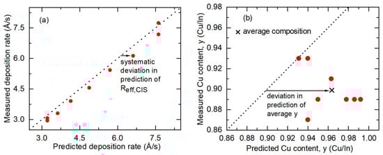 Measured CIS (a) effective thickness deposition rate Reff,CIS and (b) [Cu]/[In] atomic ratio y plotted as functions of the predicted values for the CIS layers of Figure 5 with 0.87 ≤ y ≤ 0.93. The predicted values are identified based on the two evaporation source temperatures used in the depositions. The deviations between the measurements and predictions can be assigned to variations in the Cu and In atomic concentrations from those assumed in the calibration prediction of Figure 5.