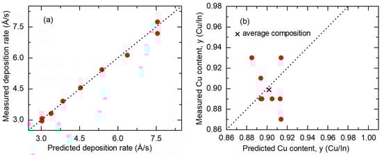 The new predictions incorporating the atomic concentration corrections described in Figure 7 are finally used to close the loop and update the results of Figure 6. For these new predictions, the source temperature settings can be used to define modified Cu and In atomic concentrations in the Cu and In2Se3 calibration films, respectively, from the corrections of Figure 7. Then, new predictions are obtained from Equations (6) and (7), but with the modified Cu and In2Se3 concentrations. These results are depicted graphically in Figure 9, which shows both the measured Reff,CIS in part (a) and the measured y in part (b), each as a function of the predicted value for the sample series of Figure 6 with 0.87 ≤ y ≤ 0.93. For the effective thickness rate Reff,CIS in Figure 9a, the measured values conform more closely to the predictions, in comparison to the corresponding results in Figure 6a obtained before the concentration corrections. For the Cu composition ratio y in Figure 9b, the points are clustered around the desired linear relation with measured values that are within ±0.05 of the predicted values and with an average that matches the prediction, in contrast to the results in Figure 6b. With the concentration corrections, the root mean square (rms) deviations between measured and predicted values decrease considerably, from 0.31 Å/s to 0.17 Å/s for Reff,CIS, and from 0.074 to 0.025 for y. The rms deviation of 0.025 from y is consistent with the estimated measurement error of EDS of ±0.03.