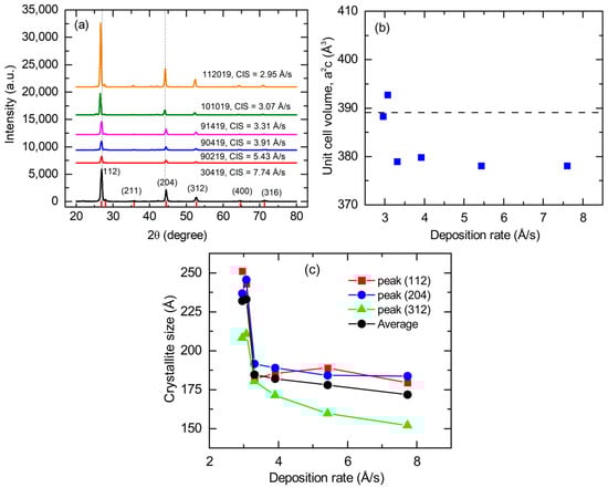 (a) X-ray diffraction (XRD) patterns with deduced (b) crystallographic unit cell volumes and (c) crystallite sizes for a series of CIS thin films deposited at different rates with y = 0.90 ± 0.03 at a substrate temperature of 570 °C. These films were deposited on Mo-coated soda-lime glass as co-deposited samples from the rate series of absorber layers in Figure 8 and Figure 9. In (c), Scherrer’s equation was applied independently to the first three XRD peaks representing diffractions from the (112), (220)/(204), and (312)/(116) crystal planes, and an average was also taken (black line). Parts (a,c) are reproduced from [20] with permission, 2021, IEEE PVSC.