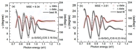 Ellipsometry angles (ψ, Δ) measured ex-situ over the photon energy range from 0.74 to 1.25 eV, along with their best fits used to determine the bandgap and Urbach tail slope for two ~2 μm-thick CIS films with measured effective thickness deposition rates of (a) 3.18 Å/s and (b) 6.23 Å/s and y = 0.90 ± 0.03. These samples were deposited on crystalline silicon wafer substrates at a temperature of 570 °C.
