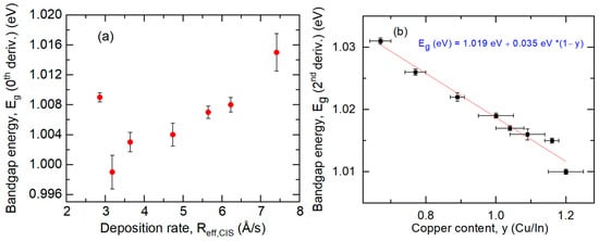 Figure 12a shows the resulting bandgap Eg and its confidence limits for the complete set of CIS films. The bandgap is observed to decrease gradually by ~0.015 eV upon reduction of the deposition rate with a more abrupt increase at the lowest rate. Shown for comparison in Figure 12b is the bandgap plotted versus composition y reported earlier, obtained by mapping SE for a compositionally non-uniform CIS sample deposited at a rate of 7.6 Å/s to a thickness of 600 Å on c-Si at 570 °C [33]. Although the thicknesses of the films in Figure 12a,b differ considerably, the bandgap for the thin sample, Eg = 1.022 ± 0.001 eV, according to the equation in Figure 12b with y = 0.90 ± 0.03, is In reasonable agreement with that for the thick sample Eg = 1.015 ± 0.003 eV in Figure 12a, with the same intended rate of 7.6 Å/s.