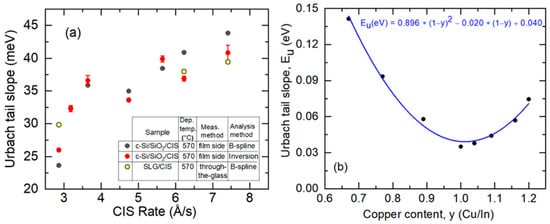 (a) Urbach tail slope parameters deduced from the imaginary parts of the dielectric functions ε2 plotted as functions of deposition rate for CIS films with y = 0.90 ± 0.03 deposited at 570 °C. The ε2 spectra were obtained in different ways, including by inversion using fixed structural parameters (red-filled circles) and by B-spline smoothing of the inverted result (black-filled circles), both for films on c-Si wafer substrates. In addition, results obtained from ε2 deduced by through-the-glass SE for CIS films on soda-lime glass substrates are included (open circles). (b) Urbach tail slope parameter as a function of composition ratio y from mapping SE for a 600 Å-thick, non-uniform CIS sample deposited at a rate of 7.6 Å/s from Reference [33]. Part (b) is reproduced from [33] with permission, 2018, IEEE WCPEC.