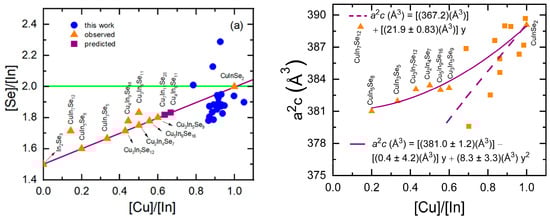 (a) Relationship between the [Se]/[In] atomic ratio and the [Cu]/[In] atomic ratio for defect models consisting of Cu vacancies without (green line) and with compensating defects (violet line). The compensating defect model 2VCu-InCu is assumed here along with the associated predicted (squares) and observed (triangles) phases [31,32]. Experimental data collected in the present study are also shown for CIS as absorber layers in solar cells (circles). (b) Unit-cell volumes from XRD studies of CIS in the literature [27] and the following ordered defect phases derived from CIS, including Cu3In5Se9 [39], Cu5In9Se16 [39], Cu2In4Se7 [39], Cu3In7Se12 [40], CuIn3Se5 [39], CuIn5Se8 [41,42], and CuIn7Se12 (triangles) [43]. Also shown are corresponding results for a collection of 11 thin-film samples with 0.6 < y < 1.0 (squares) [44].