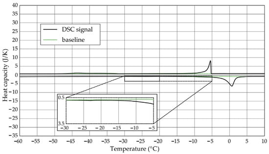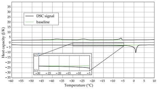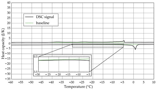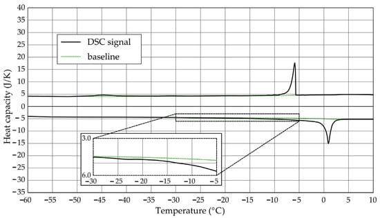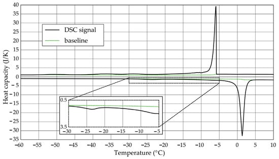 In porous materials, we can distinguish different types of water: those that undergo a phase change and those that do not. Under conditions of negative temperatures, part of the water remains in the liquid state; this water consists of unfrozen and non-freezable water content. The unfrozen water content corresponds to free water and weakly adsorbed water on a material surface. The amount of unfrozen water content decreases as the temperature decreases. Non-freezable water does not undergo a phase change to ice, even when temperatures drop below freezing. This fraction of water consist of water molecules strongly bound to the surface of the material and water in pores with a diameter under 2.4 nm [3,4]. Freezing of water is an exothermic process while melting is an endothermic process. The amount of heat released or supplied to the system during this change depends on the heat of phase change L(T). It is assumed that the latent heat of fusion of water is 334 kJ/kg at a temperature of 0 °C and normal atmospheric pressure (1 atm). The most common method for assessing the heat of phase change of water in a porous material at negative temperatures is differential scanning calorimetry (DSC) [5]. Knowledge of the unfrozen water content is used to assess the frost durability of mortars, concretes, rocks and ceramics, issues in geotechnical engineering, pavement engineering and food processing and research on the structure of porous materials using thermoporometry [6,7,8,9].