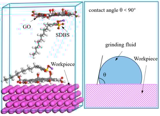 The composition of the grinding fluid for barrel finishing is deionized water (400 mL), GO (0.2 g), and the sodium dodecyl benzene sulfonate (SDBS, 0.4 g). The thickness of the GO is 1 nm, and the particle size of the GO is about 5~100 μm. For preparing grinding fluid, the GO was added into deionized water and stirred for 60 min by ultrasonic method at room temperature. Then, the sodium dodecyl benzene sulfonate (SDBS) was added into the solution. The SDBS adsorbed on GO based on self-assembly properties, by the Coulomb interaction and the van der Waals interaction, and the contact angle between the grinding fluid and workpiece is less than 90°, as shown in Figure 1 []. The self-assembly of molecules represents that the GO can be stably dispersed in the grinding fluid. It shows that the grinding fluid has a certain degree of stability. The grinding fluid and workpiece will always maintain microscopic contact when the contact angle is less than 90° between them. This means that the grinding fluid has a certain degree of wettability. That is to say that the grinding fluid can continuously work on the surface of the workpiece, making the surface roughness of workpiece better.