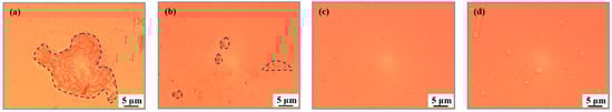 Comparative to what was observed of c, the COD value of solution A3 is lower than that of solution A1 and the COD value of the grinding fluid A6 is lower than that of solution A5. In addition, both solution A3 and solution A6 after separation and filtration have changed from a black state to a colorless state. It shows that the GO and impurities generated during finishing are almost completely removed, and there are still non-solid substances that affect COD. Through optical microscope observation, it is found that there are still granular colloidal substances in solutions A3 and A6, as shown in Figure 5c,d. And, the size of the granular colloidal substances in solution A6 is slightly larger than that in solution A3. GO in the grinding fluid can be used as an adsorbent to remove a certain amount of surfactant SDBS. However, a portion of SDBS will still remain in the liquid when SDBS is excessive. SDBS as surfactant will aggregate to form a certain amount of colloid in the liquid, affecting the COD value.