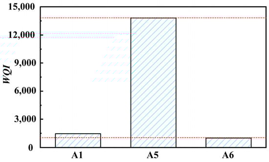 The WQI values of solutions A1, A5, and A6 were obtained, as shown in Figure 6. The water quality index value greatly increases after barrel finishing. However, the water quality index value rapidly decreases after physical separation, with a decrease rate of about 90%. Through simple wastewater treatment, grinding fluid cannot meet the requirements of direct discharge of wastewater. However, it can still effectively control water quality and ensure the feasibility of the reuse of grinding fluid.
