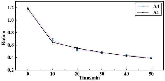 To determine the finishing effectiveness of reusing grinding fluid, barrel finishing experiments were conducted using the surface roughness Ra of the workpiece as an indicator. As shown in Figure 7, the surface roughness Ra was obtained after 50 min of finishing. As per the effect of solution A4, the surface roughness of the workpiece changes from 1.191 μm to 0.398 μm. Per the effect of solution A1, the surface roughness of the workpiece changes from 1.186 μm to 0.388 μm. The surface roughness curve of A4 is similar to the surface roughness curve of A1. This indicates that the reused grinding fluid can still effectively finish the workpiece. The reused grinding fluid also ensures minimal contact force between the workpiece and media during the barrel finishing process. A better surface roughness was obtained with minimal contact force in barrel finishing [].