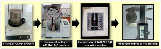Tungsten carbide vials and balls were used in the milling process. The milling vial capacity is 125 mL, and the ball sizes are 5 mm. The ball-to-powder weight ratio used in the mechanical milling processes was selected as 10:1. Pre-shaping was first applied in a mold made of hot work tool steel to ensure better packing and sintering of the AA2024-B4C composite powders containing different ratios of B4C subjected to mechanical milling for different durations. The pre-shaping pressure was 600 MPa. The pre-shaped composite samples were held under vacuum at 560 °C for 3 h. At the end of this period, the samples were re-pressed at 600 MPa using a uniaxial press. More precisely, the samples were produced using the hot-pressing method. Cylindrical samples with a diameter of 30 mm were directly produced in molds with the relevant dimensions as wear test samples. The production steps followed in manufacturing AA2024-B4C composites are shown in Figure 1.