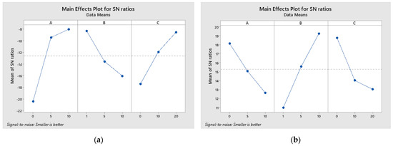 The experimental findings have been converted into a signal-to-noise (S/N) ratio, with the signal representing the mean value and the noise indicating the standard deviation. Taguchi utilizes this ratio to evaluate quality characteristics across various types of loss functions. These relationships are distinguished into three types: “smaller is better”, “larger is better” and “nominal is best”. In this study, the emphasis is on minimizing, so the S/N ratio was determined using the provided equation. The S/N ratio for achieving the minimum WL (wear loss) and CoF (coefficient of friction) is expressed by the characteristic “smaller is better” and is calculated using the following equation [25,26]: