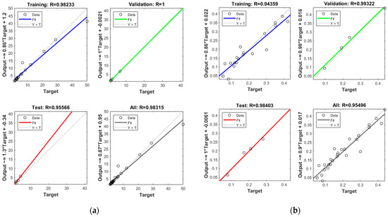 Before the selection of appropriate networks, the networks with different numbers in the hidden layer (5–30) and activation functions (tansig and logsig) were trained. In this paper, two feed-forward back propagation ANNs are used to predict wear loss and CoF separately. The selected input for both networks was the same (content of B4C, normal load, and milling time), as well as the number of neurons in the hidden layer (10 neurons) and activation function tansig, while only the outputs were different (wear loss and CoF). Based on the previously mentioned results, the best results were for architecture 3-10-1 of both networks. In Figure 4a,b, regression coefficients for training, testing, validation, and overall regression coefficients for trained networks are shown. It can be observed that the overall coefficient for wear loss was 0.98315 and the regression coefficient for CoF was 0.95496. The regression coefficient values higher than 0.95 suggest that there will not be large deviations from the experimental values with the ANN prediction, which can be proven with a comparison between the obtained results. The comparative view of experimental results, regression, and ANN prediction is given in Figure 5.