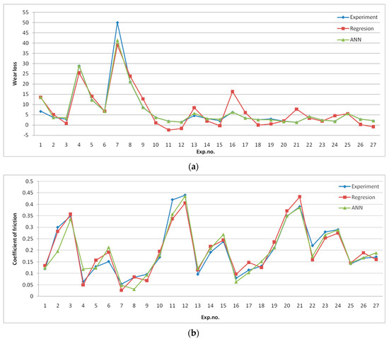 Comparative presentation of the results of the experiment, regression model, and ANN model for (a) wear loss and (b) CoF.