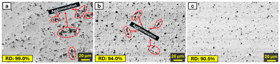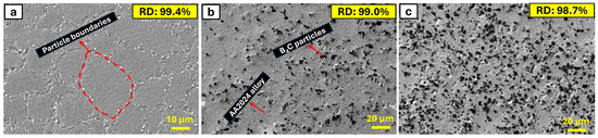 Figure 6 presents the internal structure of bulk samples produced by hot pressing AA2024 alloy and composites with 5 wt.% and 10 wt.% B4C obtained by hand-mixing the powders without milling. Figure 6a shows the internal structure of the unreinforced AA2024 base alloy, on which there are clearly noticeable boundaries between the particles. The internal structures of the composites with 5 wt.% and 10 wt.% B4C reinforcement are shown in Figure 6b and Figure 6c, respectively. The black regions observed in the internal structure of the composites represent the B4C particles. It is evident that the black regions in the internal structure obtained with 5 wt.% B4C reinforcement are significantly less than those obtained with 10 wt.% B4C reinforcement. Additionally, it is noteworthy that the particle boundaries observed in the internal structure of the unreinforced AA2024 begin to disappear with the addition of B4C. B4C particles enhance the diffusion of atoms within the AA2024 base during the sintering process [36]. The presence of these particles provides additional pathways or reduces the activation energy required for atomic movement, leading to a more uniform distribution of elements and the elimination of distinct particle boundaries. Adding B4C leads to solid solution strengthening, where the B4C particles dissolve partially in the aluminum base, altering its microstructure. This process disrupts the original grain boundaries, causing them to become less defined and more integrated into the overall base structure [37]. The presence of B4C particles acts as nucleation sites during the solidification and recrystallization processes, leading to finer grain sizes. Finer grains produce a more homogenous microstructure with less pronounced individual grain boundaries [38]. Furthermore, B4C particles impede the movement of dislocations within the base [36]. This pinning effect stabilizes the microstructure and prevents the growth of grains, resulting in a more uniform and less distinct grain boundary appearance. Additionally, it is well-known that an increase in the B4C reinforcement content leads to an increase in the porosity of the material’s microstructure because the increase in B4C reinforcement results from the hindering of hard particles during the sintering process of the composite powders. This situation inevitably leads to a decrease in the relative density (RD) values of the materials with an increase in the addition of hard particle additives, as seen in the RD values in Figure 6. While RD% values were determined by dividing the experimental density values by the theoretical density values, the porosity% values were calculated as in the previous study [30] by taking the difference of the obtained RD values from the 100% full density value. Accordingly, the calculated RD-porosity values for AA2024 alloy, AA2024 + 5% B4C, and AA2024 + 10% B4C composites are 99.4–0.6%, 99.0–1%, and 98.7–1.3%, respectively. The increase in porosity does not negatively affect the hardness and tribological properties of the material when the increase in porosity is low. This is because the B4C particles are exceptionally hard and wear-resistant, which compensates for the porosity. The inherent hardness and strength of B4C contribute to the overall hardness and wear resistance of the composite, counteracting any potential negative effects from increased porosity. Additionally, the distribution of B4C particles within the base can enhance load-bearing capacity and improve the overall tribological performance, thus maintaining or even enhancing the material’s hardness and wear properties despite the increased porosity. The porosity levels are low with the low content of B4C particles without heavy agglomeration in the microstructure [30].