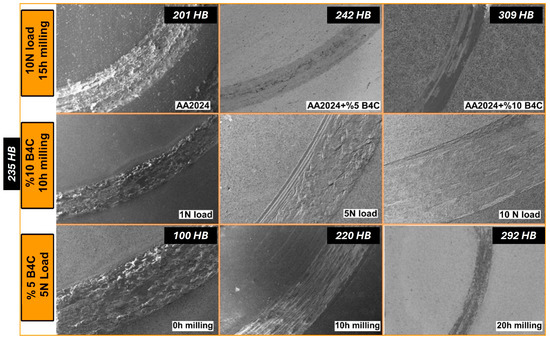 The most common method used to determine the wear phenomenon, specifically the wear losses examined in this study, is to analyze the weight losses and the sizes of wear scars formed during wear. A larger scar width indicates a higher wear loss, while a smaller one indicates a lower wear loss. Figure 8 shows the wear scars formed at different reinforcement contents, applied loads, and milling times. Initially, after examining the scars formed at constant load and milling time, it was observed that the scar widths decreased with the increasing amount of B4C. There are two main reasons for this: First, the B4C particles added to the structure increase the hardness of the composite, thus creating resistance to wear. As a result of this increased hardness, the amount of wear decreases, and consequently, the wear scar width diminishes. Additionally, the adhesion of B4C particles to the surface and the initial contact between the B4C particles and the counter surface significantly affect wear. B4C has a very high modulus of elasticity and shear resistance values. Therefore, during friction, the friction forces must exceed the shear resistance of B4C for wear to occur. However, in this study, the friction forces generated are insufficient to exceed the shear resistance of B4C. Thus, the continuous sliding motion impacts the interface bond formed between the B4C and the AA2024 base, causing the B4C particles to separate from the base phase. In other words, the counter surface must first overcome the B4C barrier to wear down the composite material. For all these reasons, as the amount of B4C increases, the amount of wear decreases, and the wear scar widths become smaller. Examining the SEM photographs obtained after wear tests performed under 1 N, 5 N, and 10 N normal loads on samples produced after 10 h of milling containing 10 wt.% B4C, it is observed that the smallest scar width occurs at 1 N load, and the largest scar width occurs at 10 N load. The increase in wear with the increasing load is an expected situation. Specifically, the separation and removal of B4C from the interface and achieving contact with the matrix in a shorter time are achieved more rapidly with this load increase. The increased load particularly causes more wear on the base material. When examining the scar widths varying with increasing milling time, it is seen that the scar widths decrease with increasing milling time. This situation is already clearly demonstrated in the weight loss measurements. The most important reason for the milling time’s effect on wear behavior is the increase in the hardness of the ground powders and, consequently, the hardness of the composites produced from these powders. In another study examining the properties of these powders and their mechanical characteristics, it was stated that the hardness of these powders increases with increasing milling time, and, accordingly, significant improvements in the hardness and strength values of the composites occur [30]. In terms of wear behavior, it can be stated that the increase in the hardness and strength values of the bulk sample due to the milling time directly leads to a decrease in the amount of wear and a reduction in the wear scar widths.B4C particles significantly enhance the hardness of the composites at consistent milling times. This improvement is attributed to the incorporation of reinforcement particles into the AA2024 base. Also, this increase is due to the relatively harder B4C particles embedded in the base, their exceptional resistance to indentation on the soft aluminum base, and the reduced particle size with further milling times. Additionally, the presence of B4C particles in the base and further milling times enhance strain hardening, further contributing to the increased hardness of the nanocomposites. Therefore, it is also evident from the worn surface images, which include hardness values in HB (Figure 8), that the increase in B4C content and milling time leads to an enhancement in the hardness of the composites. This increase in hardness is scientifically linked to the reduction in the wear scar width, consequently improving the wear resistance of the composites.