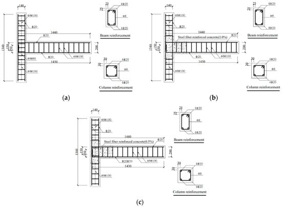 Beam-column joint specimens were designed according to Chinese standards [22,23,24]. The details of joint specimens are presented in Table 1. The volume of steel fibers, around 1.0%, enhances the mechanical properties of concrete while not dramatically decreasing its workability [25]. Therefore, the volume ratio of 1.0% steel fibers in the joint core area is used in the experiments. Figure 1 illustrates the dimensions of each joint specimen. Specimens KJ1-1 and KJ1-2 were tested to investigate the influence of different steel fiber ratios. The effect of the stirrups ratio in the joint core area was studied through KJ1-2, KJ2-1, and KJ2-2.