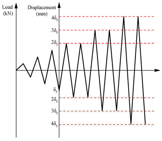 To study the influence of seismic load on beam-column joints, constant axial pressure was applied to the top of the beam-column joints; cyclic load was applied to the beam ends. Notedly, the structural performance of beam-column joints can also be affected by the axial force [26]. Increasing the axial load possibly enhances the joint shear strength thanks to the increase in the depth of the compressive strut. Given that the effect of axial force on the seismic performance of joints is not the scope of this work, the level of axial load was kept constant in the present study. The internal force of the loading joints was transmitted to the plastic hinge area of the beam ends and the core area of the column through the beam ends, which conformed to the transmission path of seismic loads. According to Chinese standards (JGJ/T101-2015) [27], the loading method adopted load-displacement joint control. Before the bearing capacity of the beam-column joint reached the yield load, the test adopted load-controlled loading. Afterward, the test adopted displacement-controlled loading. Figure 3 demonstrates the loading history. Prior to the loading test, a numerical simulation was performed to obtain the initial yield load of the beam-column joints. A 3-level load control was set for the loading test. During the loading process, the strain data of the main rebar at the beam-column joint was observed simultaneously. When the data of the steel strain gauge reached the yield strain, the load value was recorded as the yield load Py, and the displacement value of the beam-end was the yield displacement δy. The loading of the beam-column joint was then changed from a load-controlled to a displacement-controlled process. The loading test stopped when the joint specimens were damaged, or the specimens appeared to have huge deformation or cracks and were unable to bear the load, or the bearing capacity of the specimens decreased to less than 85% of the peak test load.