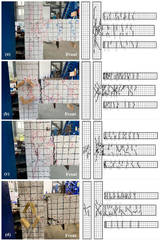 Prior to the loading test, the surface of joint specimens was painted white with latex paint, and a 50 mm × 50 mm grid was drawn, as shown in Figure 2b. At the end of each loading stage of the joint specimens, the shape and development trend of cracks were drawn on the specimens’ surface, and the loading level when cracks appeared was recorded. After the loading test, the maximum width of each crack on the surface of the beam-column joint specimens was measured using a crack width gauge to analyze the crack development and failure characteristics of the specimens.