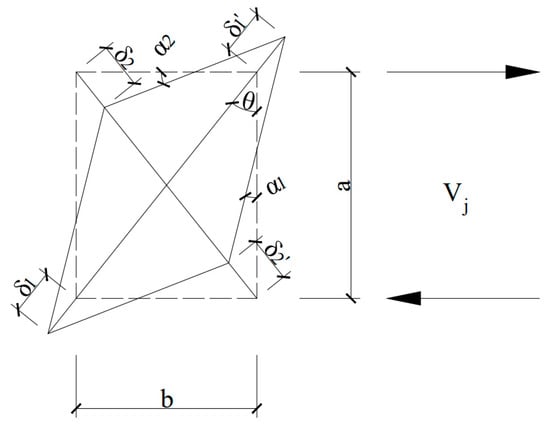 The shear deformation caused by concrete cracking in the joint core area is the main factor affecting the seismic performance of the beam-column joint. The shear deformation in the core area was measured by the change in the diagonal length of the core area (Figure 4a). As schematically illustrated in Figure 6, the rectangle represents the core area of the bear-column joint within the range of the main reinforcement. Under the action of horizontal shear Vj, one diagonal direction extends (δ1′ + δ1), and the other diagonal direction shortens (δ2′ + δ2), resulting in angles (α1, α2, and θ) after deformation. Joint shear deformation can be characterized by the shear angle γ, which was calculated through Equations (1)–(4).