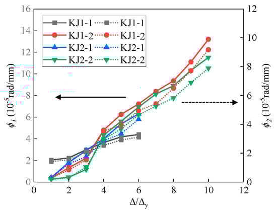 The results of the mean curvature ϕ1 and ϕ2 in the plastic hinge area are shown in Figure 9. The Δy denoted the displacement when the control mode of loading changed from load-controlled to displacement-controlled procedure. The value of Δ/Δy represented the loading level, which was the ratio of displacement amplitude to yield displacement. The maximum ϕ1 and ϕ2 of specimen KJ1-1 were 4.40 × 10−5 rad/mm and 3.11 × 10−5 rad/mm, respectively. The addition of steel fibers in the joint core area significantly increased the curvature, as shown in the results of KJ1-2 and KJ2-2. The mean curvature of ϕ1 and ϕ2 for specimens KJ1-2 and KJ2-2 were 10.34 × 10−5 rad/mm and 7.13 × 10−5 rad/mm, which were 135.0% and 129.2% higher than that of the specimen KJ1-1. It indicates that the addition of steel fibers dramatically enhances the rotation ability of the plastic hinge area at the beam end of the joint. For specimens KJ2-2 and KJ2-1, whose stirrups in core area were partly or completely replaced by steel fibers, the maximum ϕ1 and ϕ2 of KJ2-2 were 11.52 × 10−5 rad/mm and 7.89 × 10−5 rad/mm, while the maximum ϕ1 and ϕ2 of KJ2-1 were 6.29 × 10−5 rad/mm and 4.35 × 10−5 rad/mm. It indicates that partial replacement of stirrups in the joint core area exhibits superior performance compared to complete replacement. Nevertheless, completely replacing the stirrups with steel fibers still yields better rotation ability than the HSC joint.