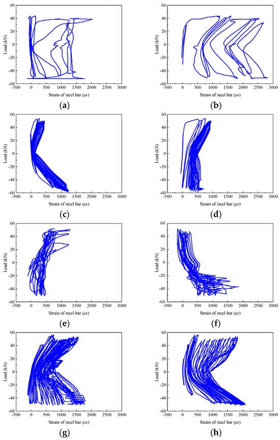 Stirrup strain in the core area for the specimen (a) KJ1-1/Y-16, (b) KJ1-1/Y-20, (c) KJ1-2/Y-16, (d) KJ1-2/Y-20, (e) KJ2-1/Y-13, (f) KJ2-1/Y-14, (g) KJ2-2/Y-16, (h) KJ2-2/Y-20. The position of the strain gauge is referred to in Figure 4c.