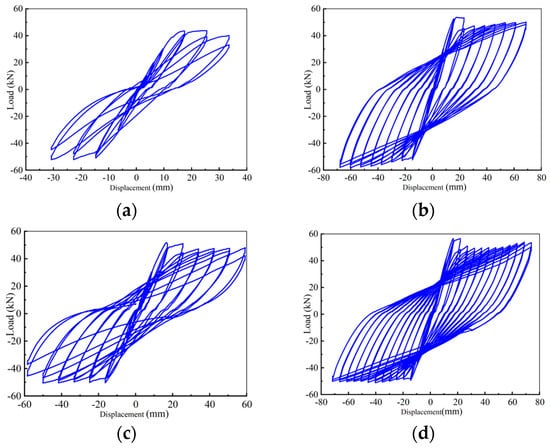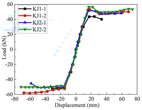 The specimen KJ1-1 demonstrated a Z-shaped hysteresis curve (Figure 11a). It indicates that the energy dissipation capacity of KJ1-1 is poor. The load decreased rapidly after reaching the peak load, and the stiffness of the specimen decreased rapidly in the failure stage. Eventually, the ultimate bearing capacity and ultimate displacement were minimal. The structure presented the worst displacement ductility performance. With the addition of steel fibers, the hysteresis curve of specimen KJ1-2 was full, indicating a stronger energy dissipation capacity than KJ1-1 (Figure 11b). The load decreased slightly after the peak load. Although the concrete on the surface of the specimen was damaged and spalling, the embedded steel fibers tightly pulled the concrete on both sides of the crack, exerting the “bridge function” of the steel fiber, as reflected in the hysteresis curve. As such, the bearing capacity of the specimen still rose until the failure stage.