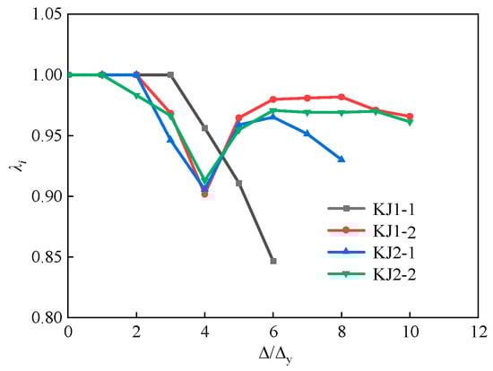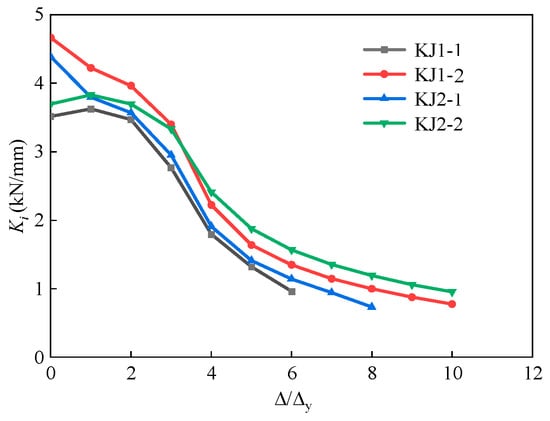 When replacing all stirrups in the core area with steel fibers, as can be seen in Figure 11c, the hysteresis curve of KJ2-1 was full and pinching compared with KJ1-1, demonstrating an inverted S-shape of the hysteresis ring. The load began to decline slowly after reaching the peak load, and the stiffness slowly declined from the failure stage. The descending speed was slower than KJ1-1. The ultimate bearing capacity, ultimate displacement, and structural displacement ductility were improved compared with KJ1-1. When partially replacing stirrups in the core area with steel fibers, as shown in Figure 11d, the hysteresis curve of KJ2-2 was full, and the hysteresis ring was arcuated, indicating a strong energy dissipation capacity. The decline of bearing capacity and stiffness showed the same trend as that of KJ1-2.