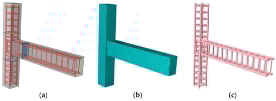 Diagram of (a) the beam-column joint model, (b) the concrete model, and (c) the reinforcement network.