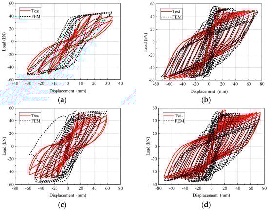 Comparison of numerical and experimental hysteresis curves for specimens (a) KJ1-1, (b) KJ1-2, (c) KJ2-1, and (d) KJ2-2.