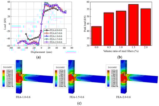 Figure 18 shows the comparison of skeleton curves and peak load in the cases of different steel fiber volume ratios. There is little difference in the initial loading stage of the skeleton curves. As the loading level increases, the skeleton curves of FEA-0.0-0.6 decreases first. As the volume ratio increases from 0.0% to 1.5%, the peak load of the model increases correspondingly. The most significant increase in the peak load occurs when the volume ratio of steel fibers increases from 0.0% to 0.5%, which is 21.9%. Nevertheless, a decrease in the peak load is displayed with an increase in the volume ratio of steel fibers from 1.5% to 2.0%. Notedly, the peak load of specimen embedding 2.0% steel fibers is still 30.6% higher than the case of no steel fibers (FEA-0.0-0.6). This shows that the load-bearing capacity of the joint can be significantly improved by adding steel fibers in the joint core area. Nevertheless, there is no single relationship between the load-bearing capacity and the volume ratio of steel fibers. The highest value of peak load occurs in the case of a 1.5% volume ratio of steel fibers. Further increment of steel fibers in the core area decreases the peak load. This is due to the fact that a higher amount of steel fibers (e.g., volume ratio greater than 1.5%) decreases the compressive properties of concrete [37]. Studies have shown that a large amount of steel fibers induces poor mixing and consolidation of the concrete matrix, entrapping air in the concrete [40]. Observably, when the volume ratio of steel fibers is no more than 1.5%, the extent of concrete compression damage in the joint core area reduces with increasing the amount of steel fibers (see FEA-1.0-0.6 and FEA-1.5-0.6 in Figure 18c). However, as the volume ratio of steel fibers increases from 1.5% to 2.0%, the extent of concrete compression damage deteriorates. The displacement ductility coefficients present a similar trend, as shown in Figure 19.